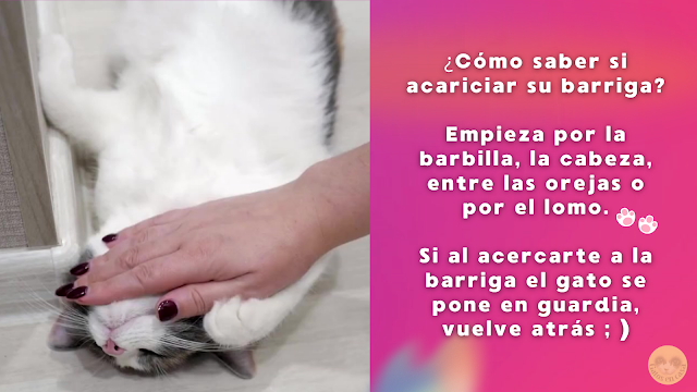 En este vídeo se recomienda ir con cuidado y no lanzarse a acariciar una barriguita felina solo porque sea esponjosa y el gato esté relajado. Estas señales no son una invitación a acariciarlas, así que mejor aplicar algún truco si no estamos seguros de la reacción del gato. En el vídeo se aconseja empezar por la barbilla, la cabeza, entre las orejas o por el lomo. Si al acercarte a la barriga el gato se pone en guardia, volver atrás ; ) Una mirada rápida, un rasguño, un mordisco o un cambio de postura son una advertencia. Observar el lenguaje corporal es la clave para no caer en la «trampa» de las barriguitas.